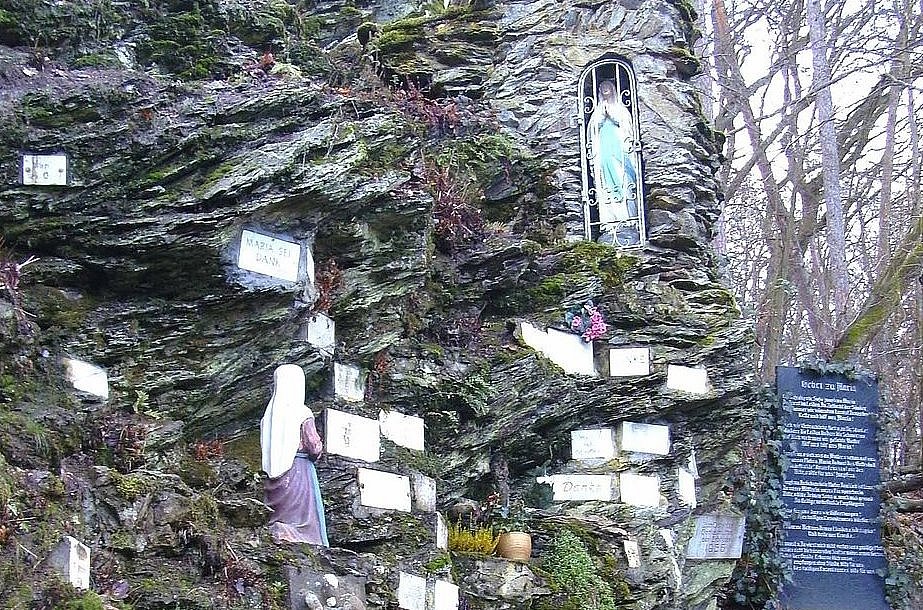 Die Mariengrotte zieren 7 Steine, die in Lourdes in Frankreich bei einem Dankbesuch in heiliges Wasser getaucht und dann hier in Form einer Blume an der Grotte eingemauert wurden. Die Pfarrgemeinde pilgert regelmäßig in den Monaten Mai und Oktober zum Feiern von Andachten an diesen Ort.