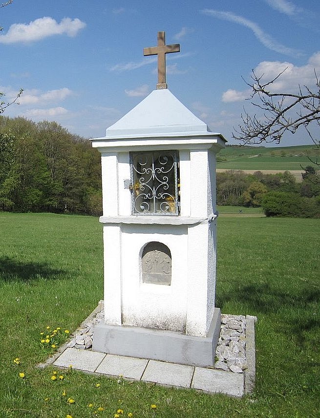 Kurz vor dem Wald steht ein Heiligenhäuschen. Es ist der Schmerzhaften Mutter Maria geweiht zum Troste der Armen Seelen.