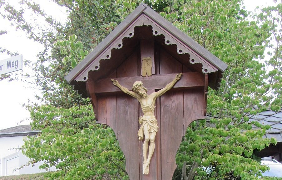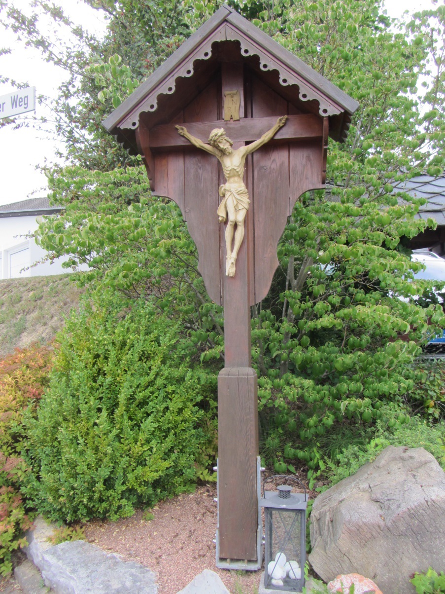 Das Holzkreuz stammt vom Samerberg aus Bayern und der Korpus von einer in der Gemeinde ansässigen Pietät. Es wurde 2006 als Erinnerung an einen Verstorbenen errichtet.